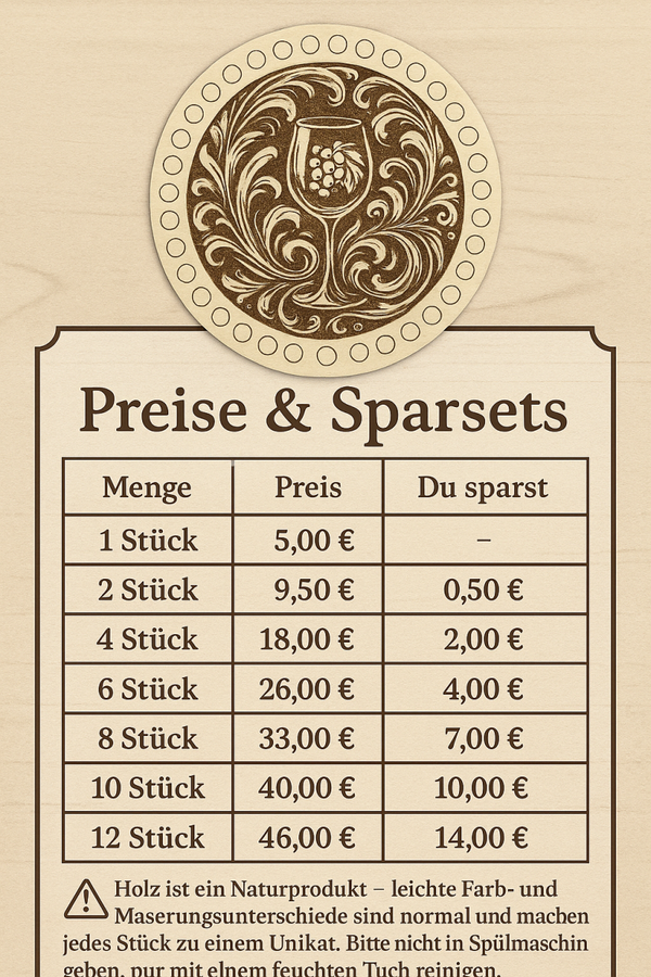 Ein kleines Stück Handwerkskunst für Tisch & Herz: Unser runder Holzuntersetzer (Ø 9 cm) ist detailreich graviert und zeigt ein kunstvolles Motiv aus Weinflasche, Glas und Trauben – liebevoll gestaltet und mit zarten Ornamenten umrahmt. Jedes Stück wird von Hand gefertigt und ist ein echtes Unikat.