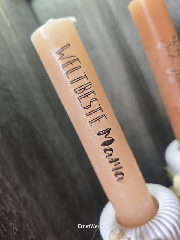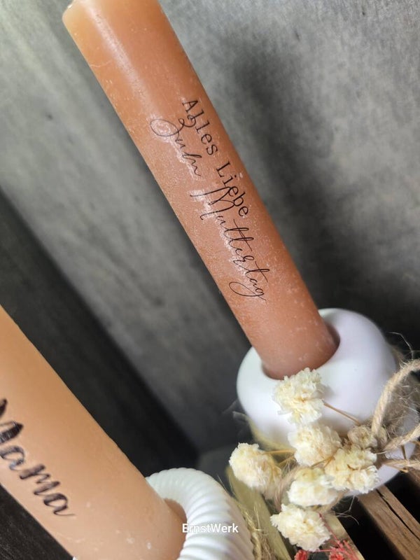 Die Kerzen sind mit liebevollen Sprüchen zum Muttertag versehen –